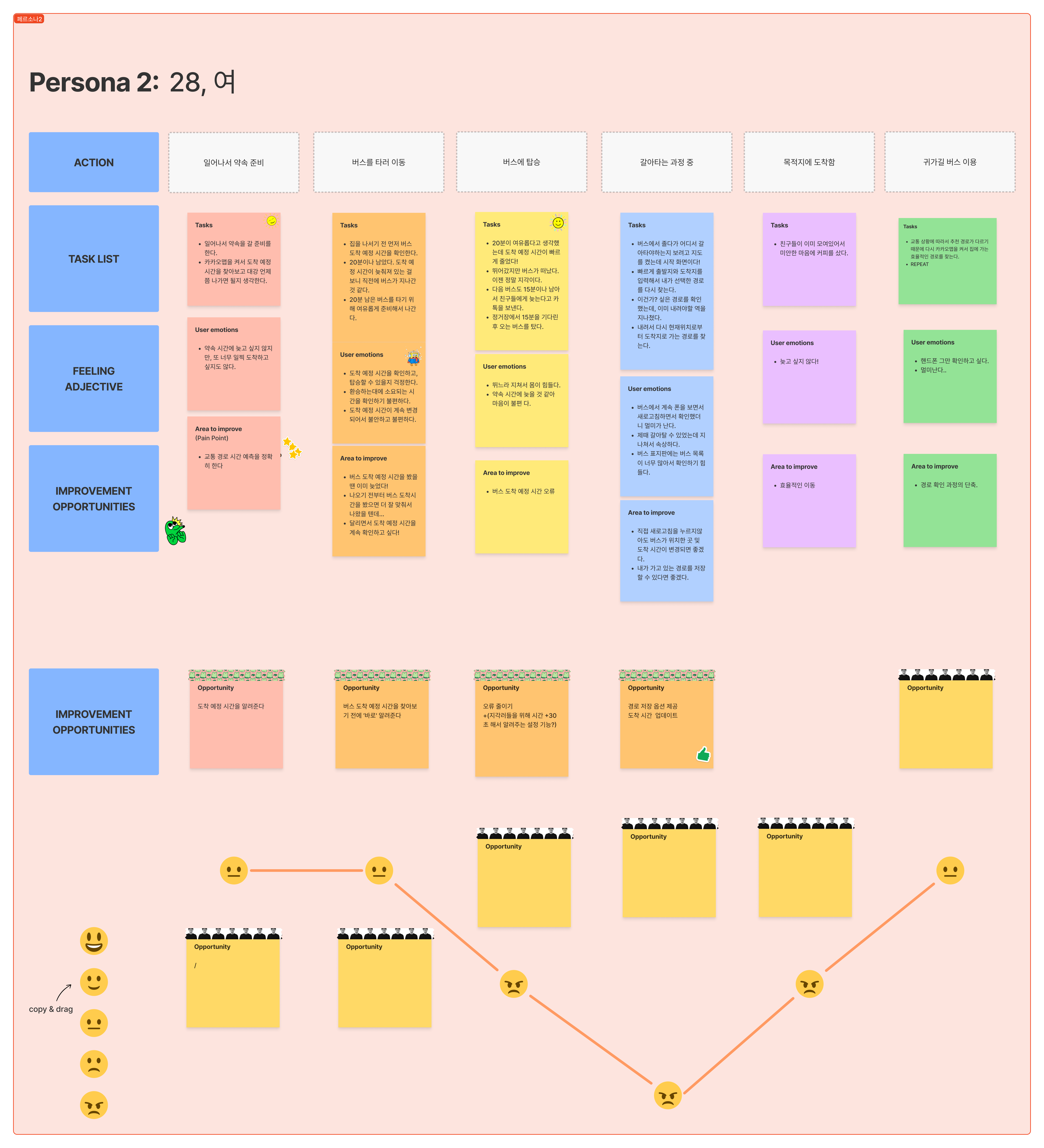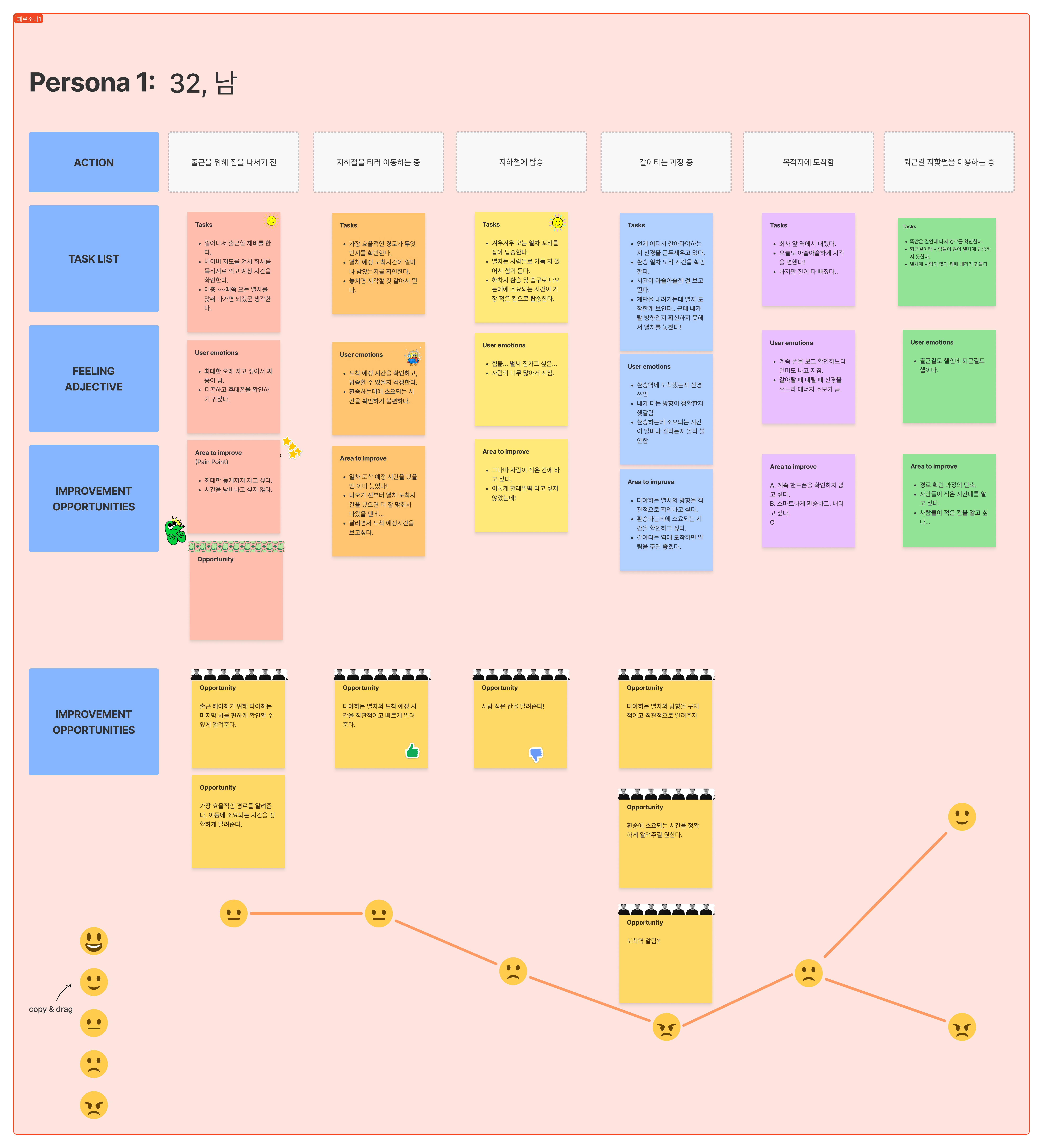 해당 인터뷰를 토대로 두개의 페르소나를 정리하였는데, 크게는 버스와 지하철을 주로 이용하는 이용자의 패턴이 달랐고, 1) 열차 시간, 2) 효율적인 이동 경로, 3) 환승에 필요한 시간, 4) 막차 알림, 5) 자주 이용하는 경로 저장 등 다양한 니즈가 있다는 걸 알 수 있었다.