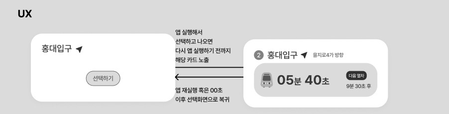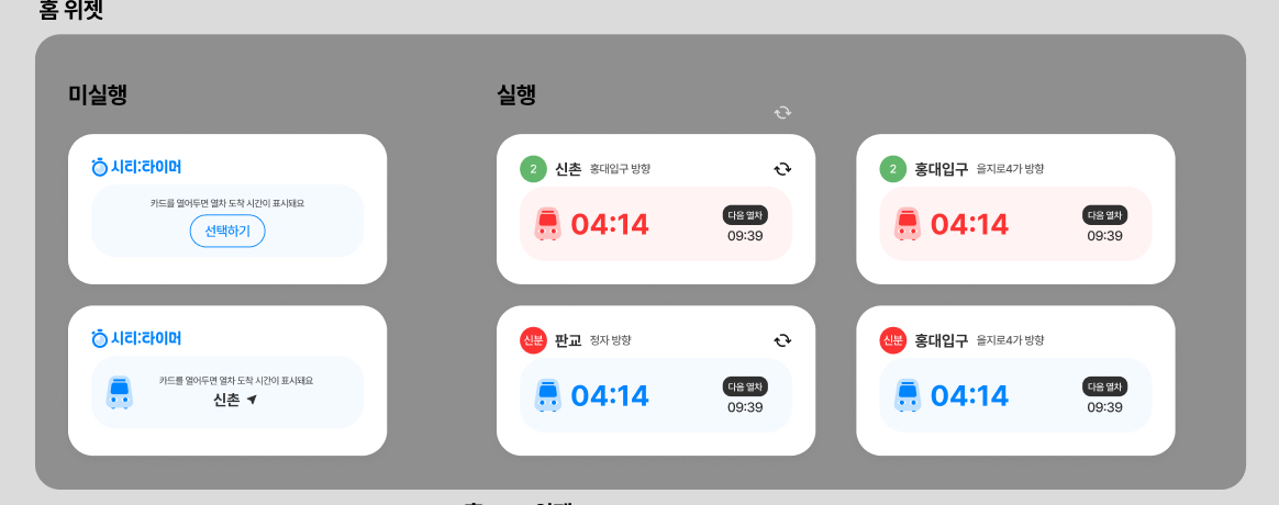 그래서 최종 디자인으로는 현재 위치를 알려주되, 위젯으로 앱을 실행하고 원하는 열차 정보 카드를 열어두면 해당 열차의 정보가 위젯에 바로 노출되도록 하였다.