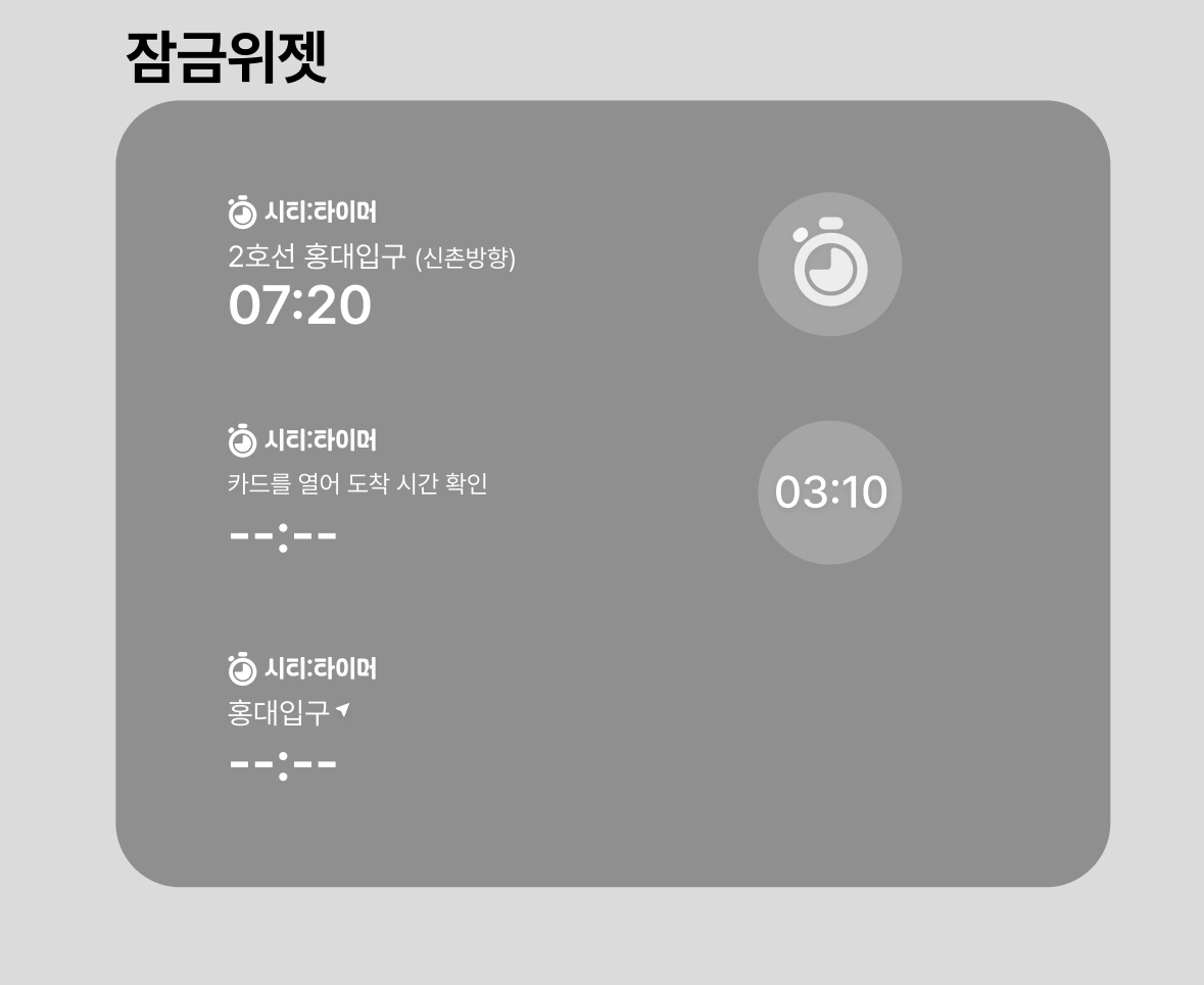 시티타이머가 제공하는 정보를 정리했을 때, 위치 기반과 저장 상세 카드가 있고, 또 위치 기반으로 바로 타이머를 보여줄 수 있는게 아니라 호선과 방향을 선택해야 그 열차 정보를 보여줄 수 있기 때문에 위젯에 바로 필요한 정보를 띄울 수 없는 구조였다.